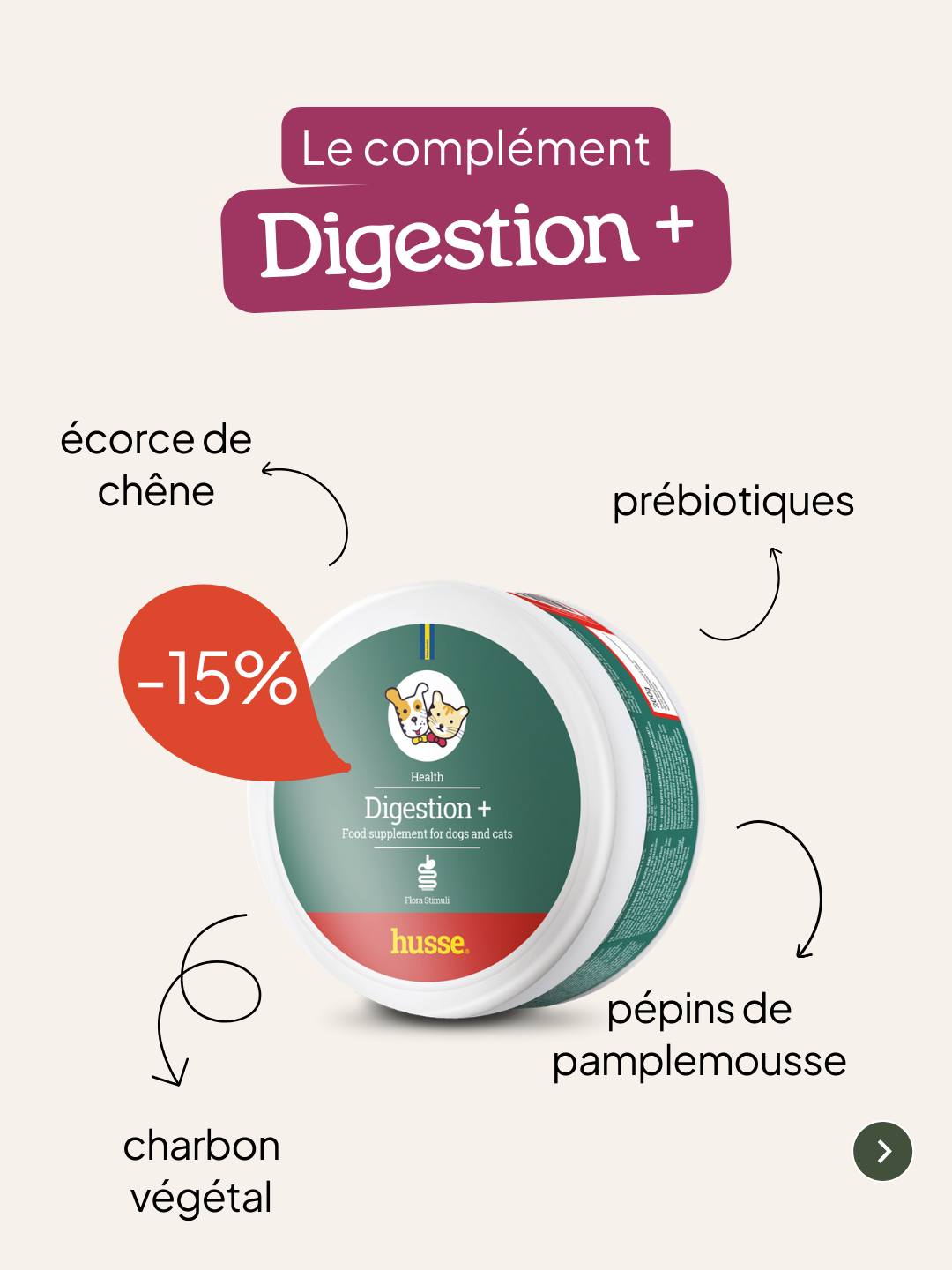 Digestion Plus de Husse est la solution naturelle pour prendre soin de la digestion de votre chien ou de votre chat. Grâce à sa composition 100% naturelle et ses bienfaits prouvés, il contribue à améliorer le confort digestif et le bien-être général de votre compagnon.